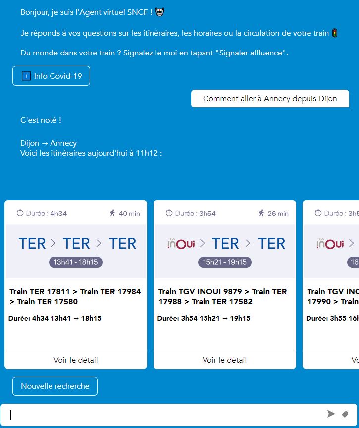- Les chatbots de la SNCF : accessibles en ligne, mais aussi sur Whatsapp ou Facebook Messenger, les assistants virtuels permettent de réserver un train, comparer les prix, déposer une réclamation et bien plus encore.