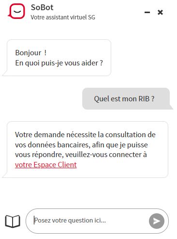 - SoBot, le conseiller virtuel de la Société Générale répond aux questions courantes concernant les produits bancaires, et fournit une assistance personnalisée.