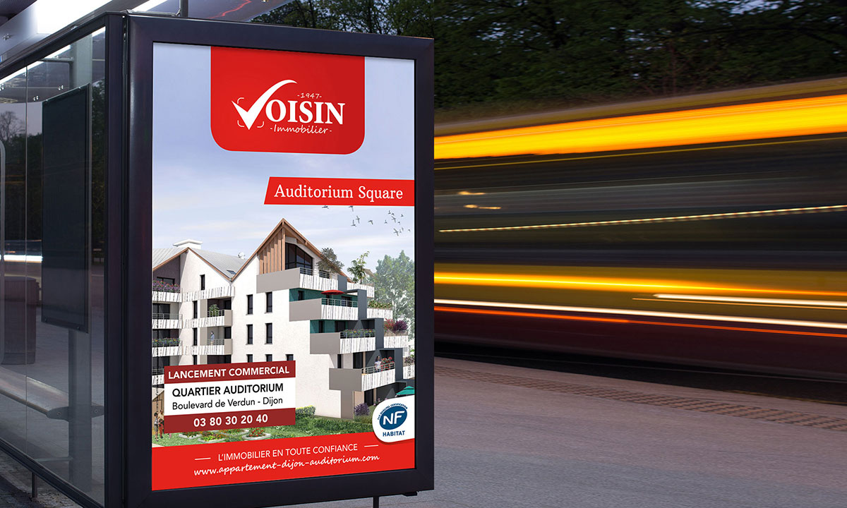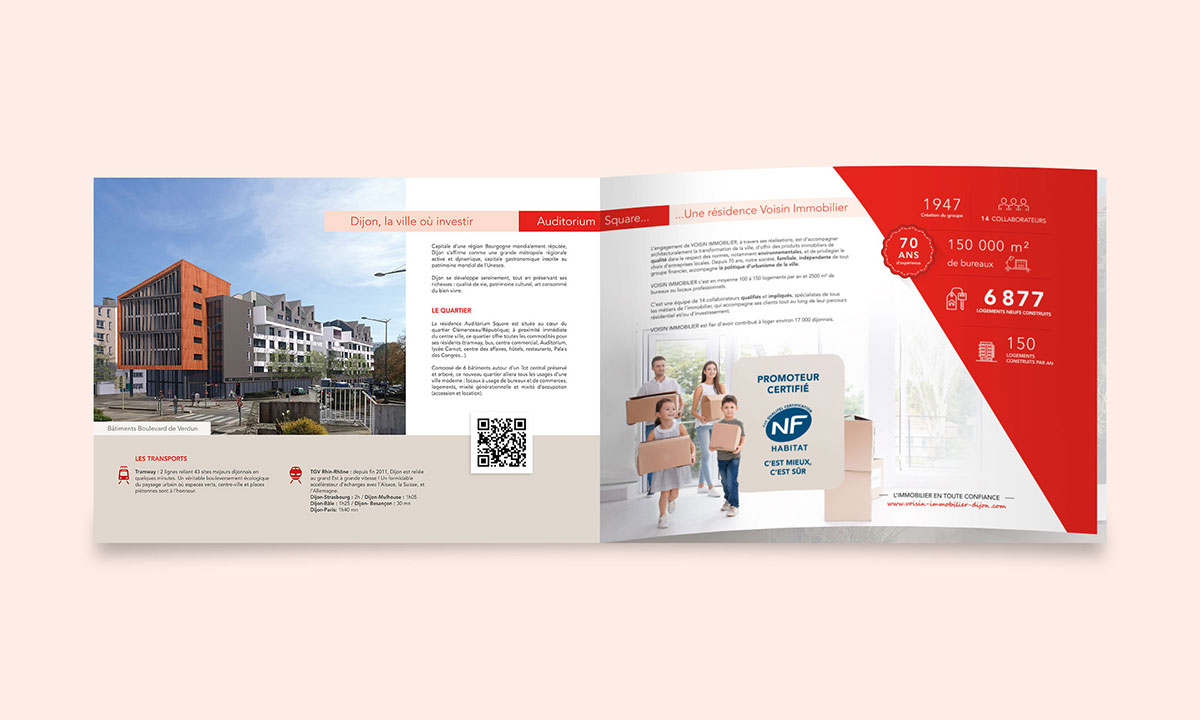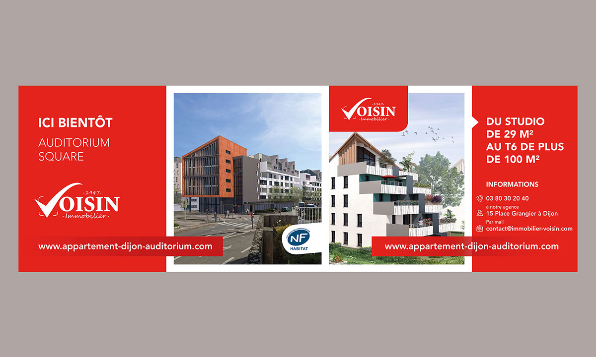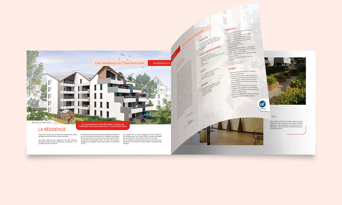 création des supports de communication destiné à la promotion du nouveau programme immobilier qui redessinera le quartier Auditorium à Dijon. Installées boulevard de Verdun, les résidences proposent un cadre de vie pensé pour que chacun puisse s'y épanouir. Propulse conçoit le visuel identitaire du programme puis ses déclinaisons en dépliant, affiche et site web, à visiter