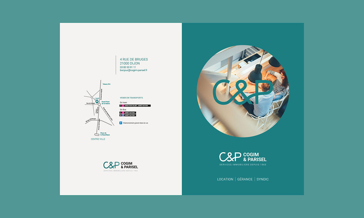 Le pilier de l'identité de Cogim & Parisel est la coexistence des deux entités pour former un tout cohérent. Pour cela nous avons fait le choix d'une approche en deux temps : d'abord explicite avec le bloc marque reprenant textuellement les deux mots ; puis implicite avec l'utilisation d'un acronyme formé pour l'occasion autour de l'esperluette. Si les choix typographiques restent sobres, la singularité apportée par la liaison accentuée des deux lettres s'affiche en élégance.La baseline rassurante