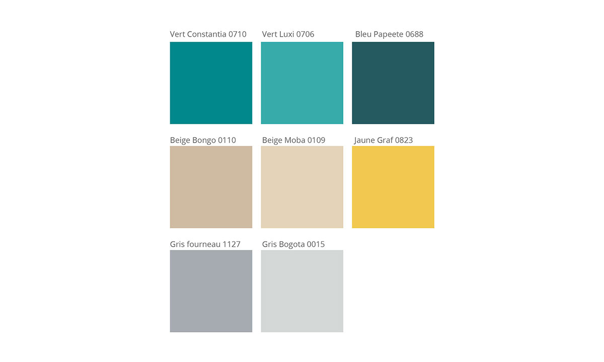 La couleur dominante du bloc marque oscille entre le vert et le bleu, toute en nuances. Adossée à des niveaux de gris, elle se trouve valorisée sans ostentation. En complément, la charte graphique prévoit une palette chaleureuse et douce qui se décline dans les supports print et web tout autant que dans la décoration des nouveaux locaux.