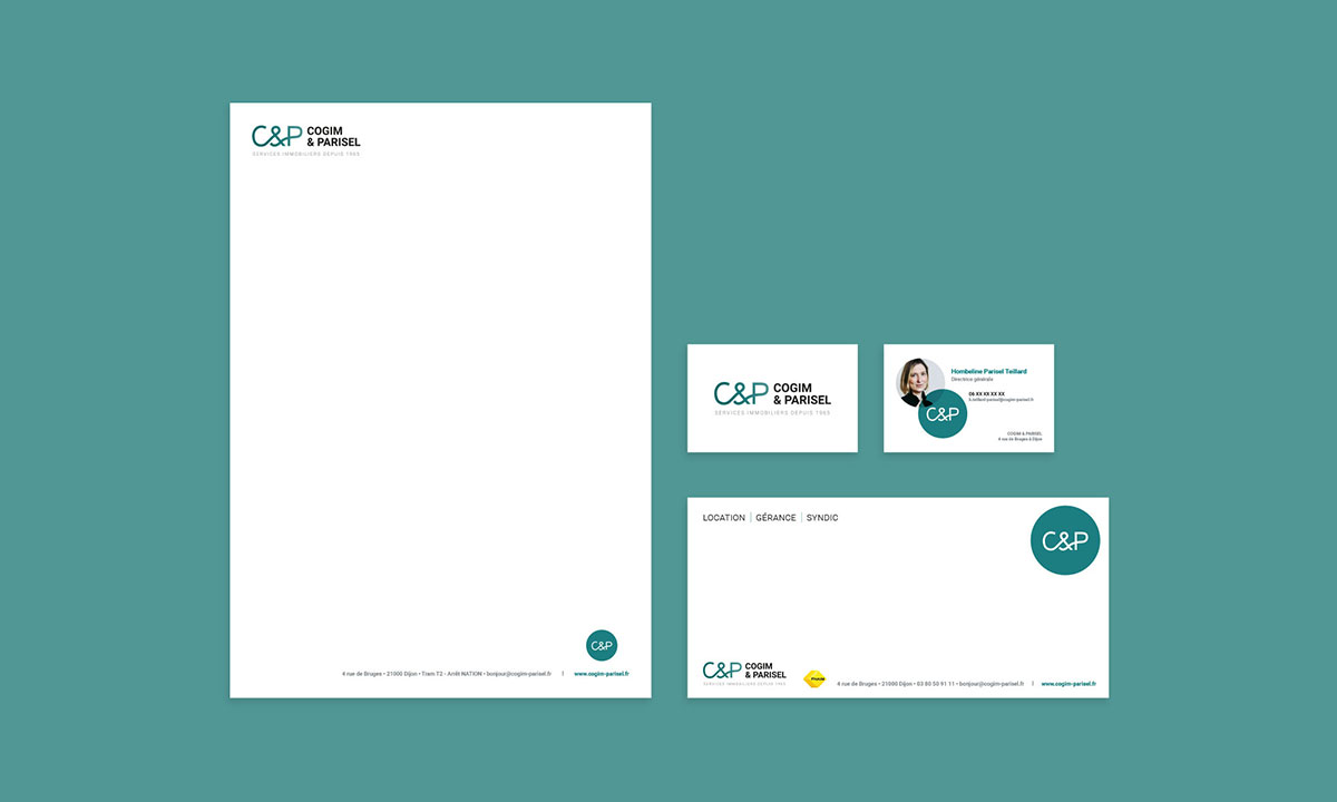 Le pilier de l'identité de Cogim & Parisel est la coexistence des deux entités pour former un tout cohérent. Pour cela nous avons fait le choix d'une approche en deux temps : d'abord explicite avec le bloc marque reprenant textuellement les deux mots ; puis implicite avec l'utilisation d'un acronyme formé pour l'occasion autour de l'esperluette. Si les choix typographiques restent sobres, la singularité apportée par la liaison accentuée des deux lettres s'affiche en élégance.La baseline rassurante