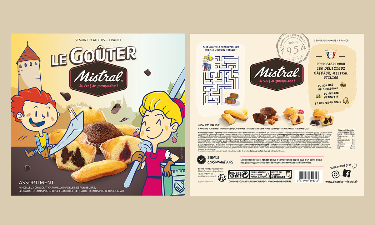 Mistral confie à Propulse la conception et la réalisation de sa toute première boite à goûter. Si les gourmandises fabriquées à Semur-en-Auxois séduisent les grands, elles sont également dévorées par les plus petits, en particulier au goûter. Pour le design de cette boite d'assortiment, Propulse mobilise son savoir-faire en matière d'illustration pour donner vie à des personnages et à une scène inédite, clin d’œil au passé médiéval de Semur-en-Auxois.