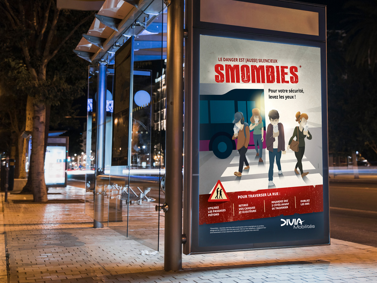 L'enjeu est sérieux car il concerne souvent notre sécurité, notre santé ou celles des autres. Dans la foultitude de messages ou d'informations qui nous arrivent, Propulse imagine avec DiviaMobilités une campagne de communication originale qui met en scène des Smombies, un hybride sémantique à mi-chemin entre le "smartphone" et le "zombie". Quoi de plus dangereux que de traverser la route avec le casque vissé sur les oreilles et les yeux rivés à son écran ? La baisse attentionnelle peut être dramatique en zone urbaine et c'est sur ce sujet que DiviaMobilités interpelle avec cette campagne.
