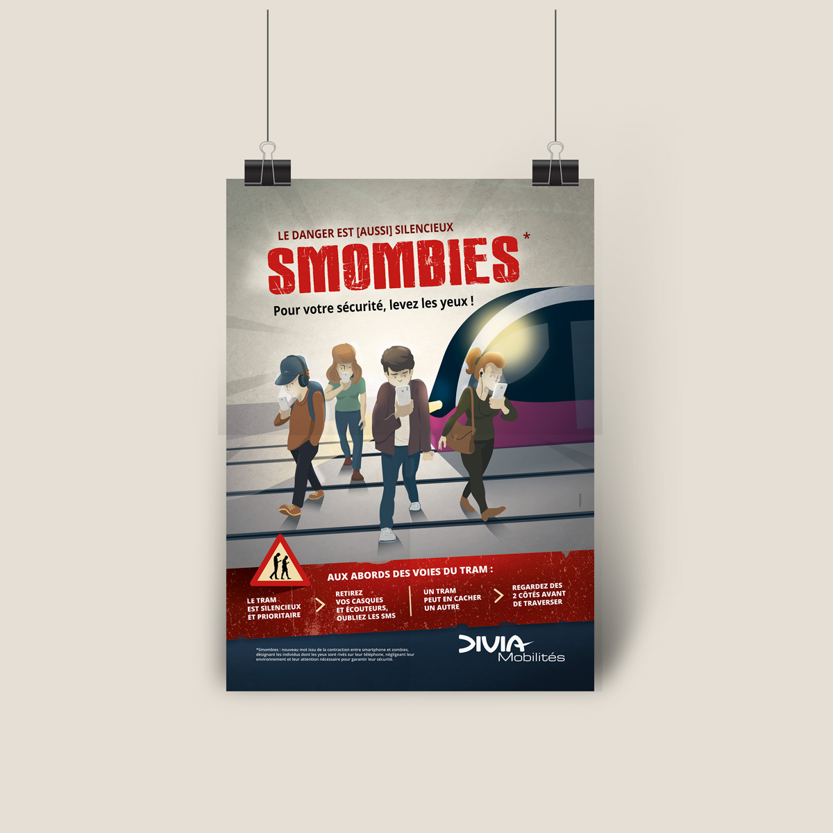 L'enjeu est sérieux car il concerne souvent notre sécurité, notre santé ou celles des autres. Dans la foultitude de messages ou d'informations qui nous arrivent, Propulse imagine avec DiviaMobilités une campagne de communication originale qui met en scène des Smombies, un hybride sémantique à mi-chemin entre le "smartphone" et le "zombie". Quoi de plus dangereux que de traverser la route avec le casque vissé sur les oreilles et les yeux rivés à son écran ? La baisse attentionnelle peut être dramatique en zone urbaine et c'est sur ce sujet que DiviaMobilités interpelle avec cette campagne.