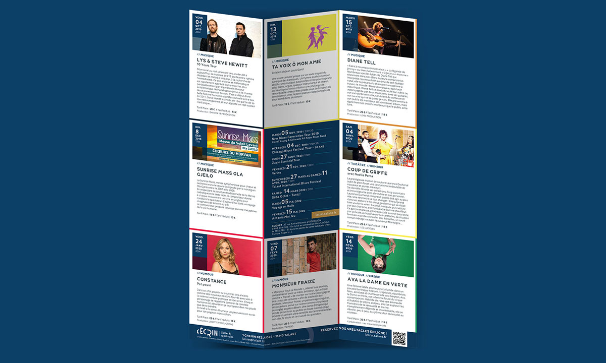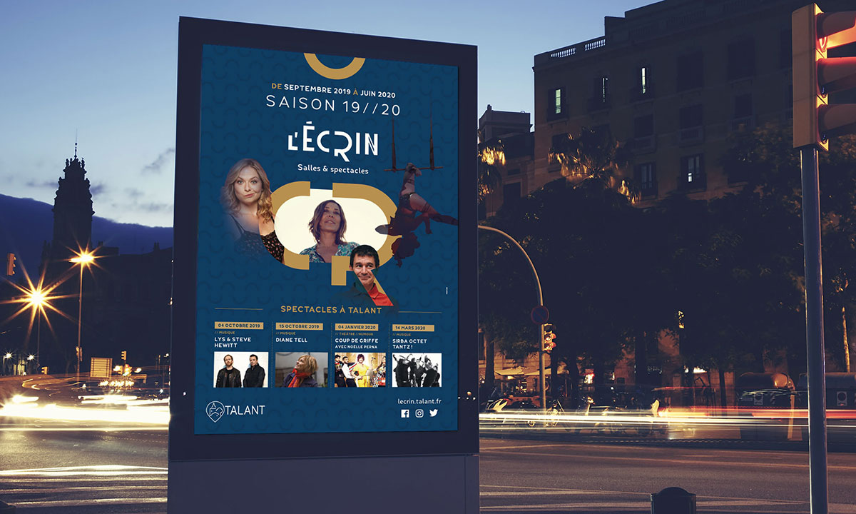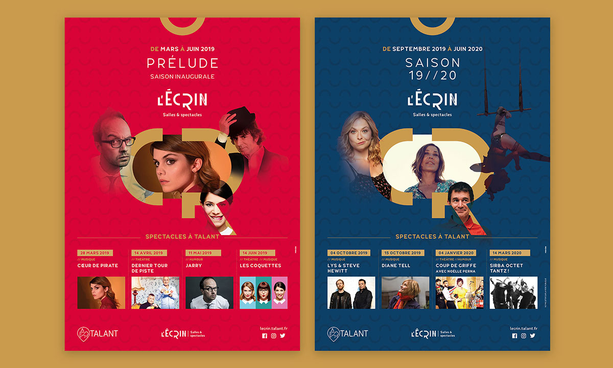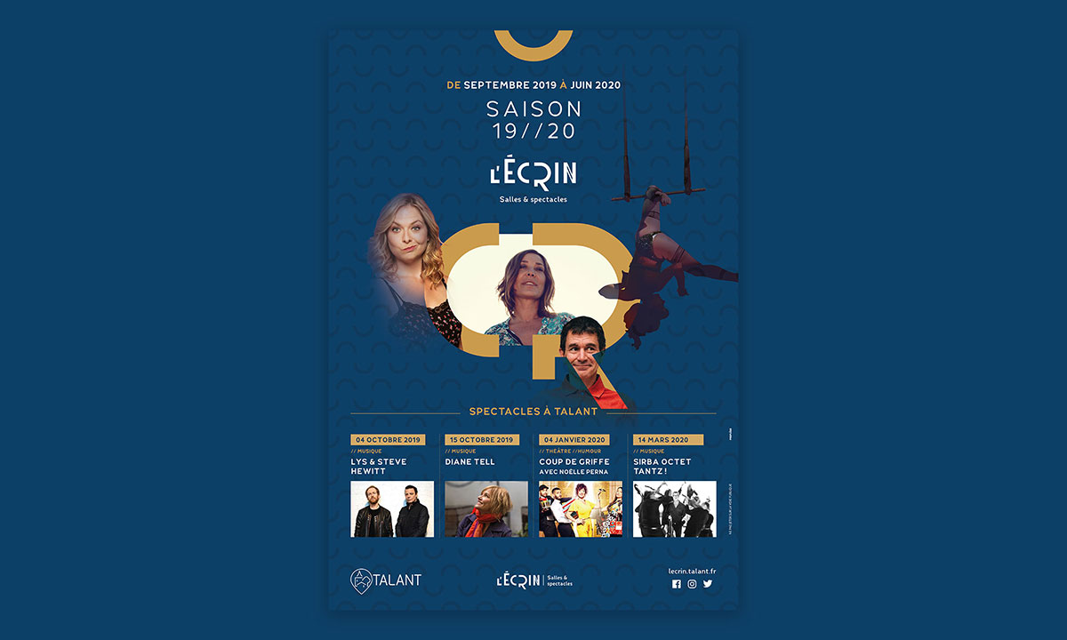 L’Écrin confie à Propulse le soin d'habiller sa nouvelle saison culturelle. Dans le sillon des codes graphiques installés pour la saison Prélude, Propulse réalise les visuels de promotion pour cette saison marquée par la diversité de sa programmation. La composition du visuel s'articule autour des éléments graphiques symbolisant le "cocon" de cette salle intimiste de 442 places. Les visages des artistes viennent renforcer cette idée de proximité tout en divulguant des indices de la programmation.