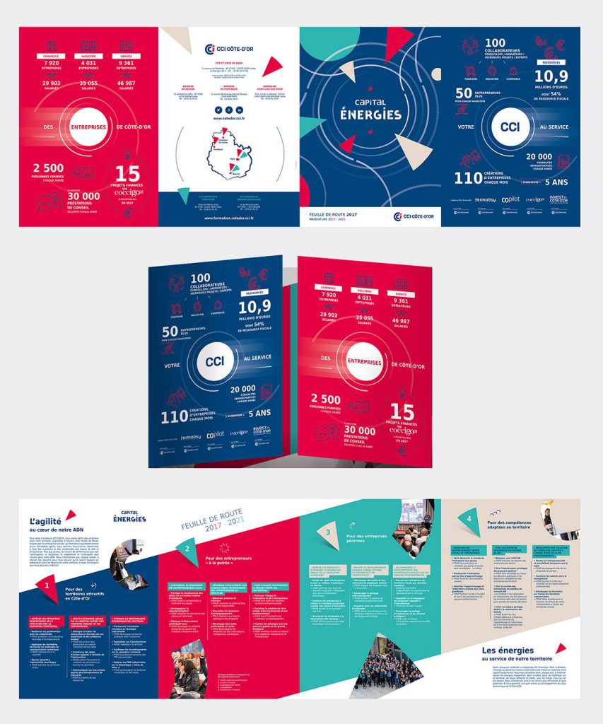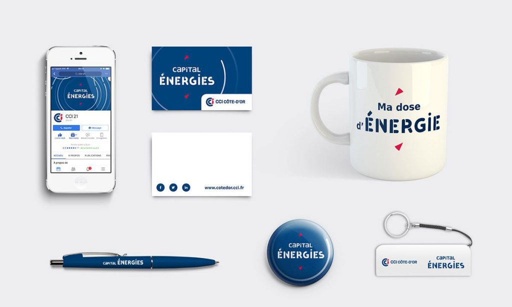 Le leitmotiv de la mandature 2017-2021 propose de rassembler les énergies, de les capter mais aussi de les redistribuer sur le territoire. C'est ce mouvement continu, cette circulation des énergies qui a inspiré l'univers graphique. Les énergies convergent vers la CCI de Côte-d'Or qui diffuse elle-même les énergies sur le territoire.Les codes graphiques