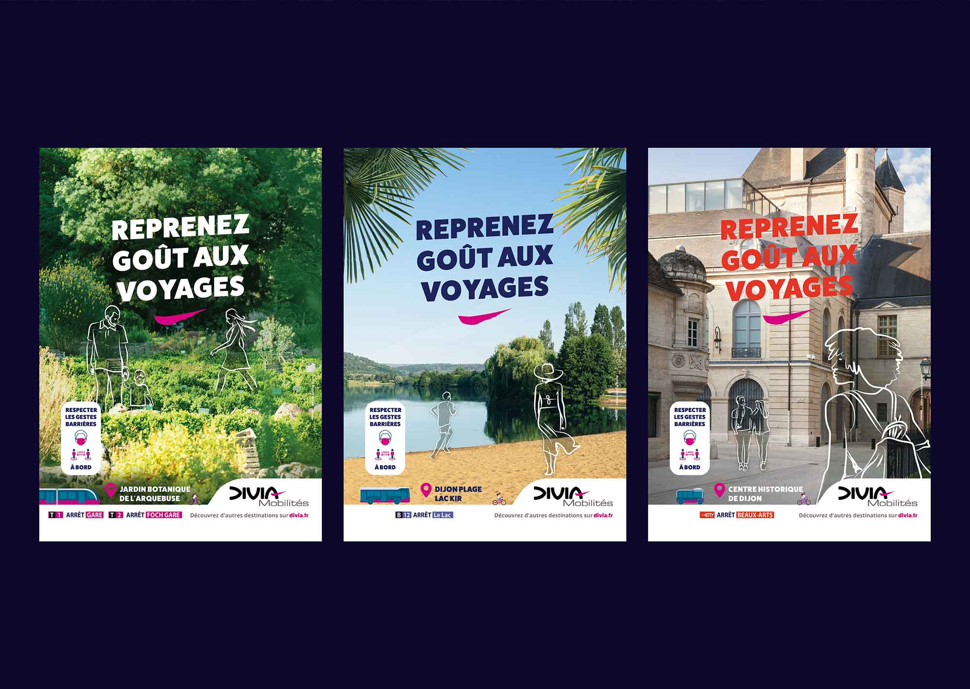 Pour Divia Mobilités, l'agence signe une campagne aux airs de vacances. Elle s'affiche durant l'été à Dijon et promeut des destinations dijonnaises, plus ou moins connues des locaux. L'objectif : positionner les transports en commun de Divia Mobilités comme trait d'union avec les destinations dijonnaises les plus dépaysantes.